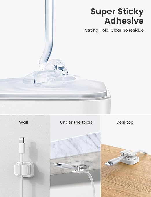 - Sturdy Acrylic Adhesive Pad: This cable management featured with a strong Acrylic adhesive pad tape that can sturdily adhere to any clean surfaces and hold various wire cords stably. Also the stickers can be clearly removed and replaced, allowing to easily change the clip location without residue adhesive or damage on desk, wall, nightstand, car, office, etc