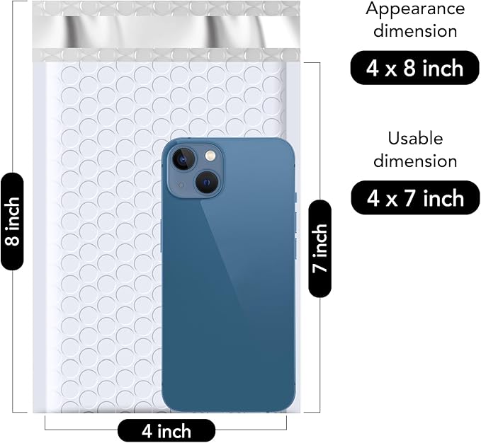 - Perfect Size White Bubble Mailers: The small bubble mailers outer size is 4x8 inch, while the inner size is 4x7 inch. It is very suitable to transport for jewelry, makeup, cards, phone case, lips, photos,handcraft and more.