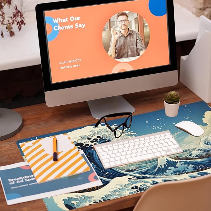 Desk Mat,Blue Japanese Sea Wave Desk Pad,Japanese Sea Wave Large Gaming Mouse Pad for Desk,Extended Big Computer Keyboard Mouse Pad with Non-Slip Base and Stitched Edge,35.4"x15.7"