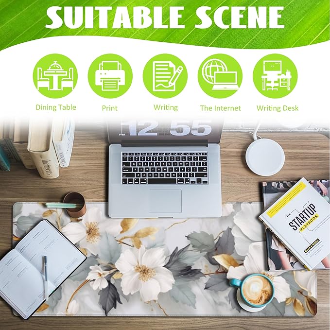 Desk Mat,White Gold Marble Desk Pad,White Flowers Golden Leaves Large Gaming Mouse Pad for Desk,Extended Big Computer Keyboard Mouse Pad with Non-Slip Base and Stitched Edge,31.5"x11.8"