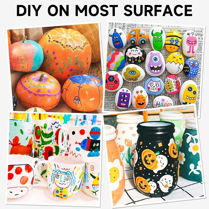 - 【MULTI-PURPOSE】: Enjoy creating art projects on a variety of surfaces, acrylic paint marker set suitable for rock painting, ceramic and mug painting, glass and wine glass painting, wood, fabric, stone, metal, plastic, canvas, Christmas ornament, Halloween pumpkin painting, scrapbook, bullet journal, custom mugs, DIY crafts projects, and much more for both smooth and porous surfaces.