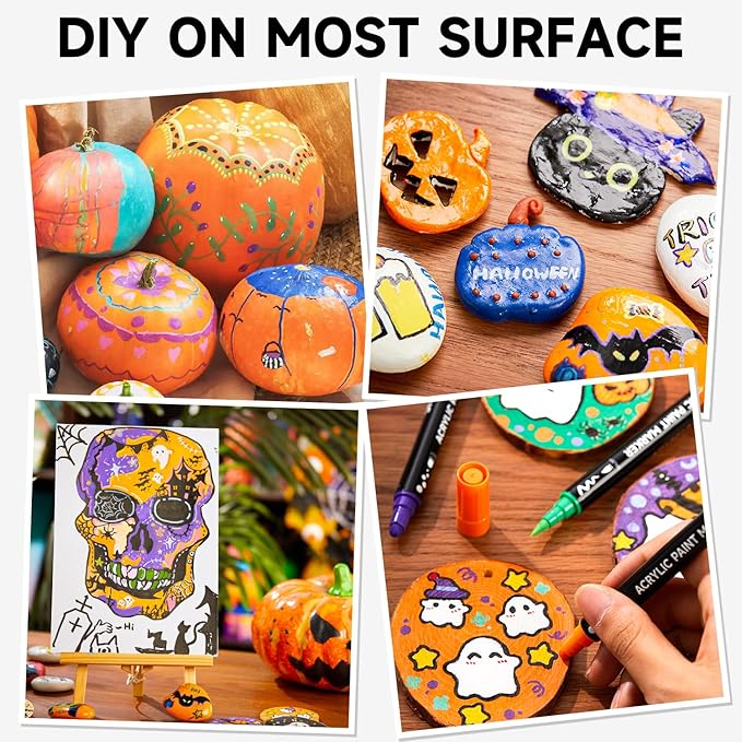 - 【MULTI-PURPOSE】: Enjoy creating art projects on a variety of surfaces, acrylic paint marker set suitable for rock painting, ceramic and mug painting, glass and wine glass painting, wood, fabric, stone, metal, plastic, canvas, Christmas ornament, Halloween pumpkin painting, calligraphy, scrapbook, bullet journal, brush lettering, custom mugs, DIY crafts projects, and much more for both smooth and porous surfaces.