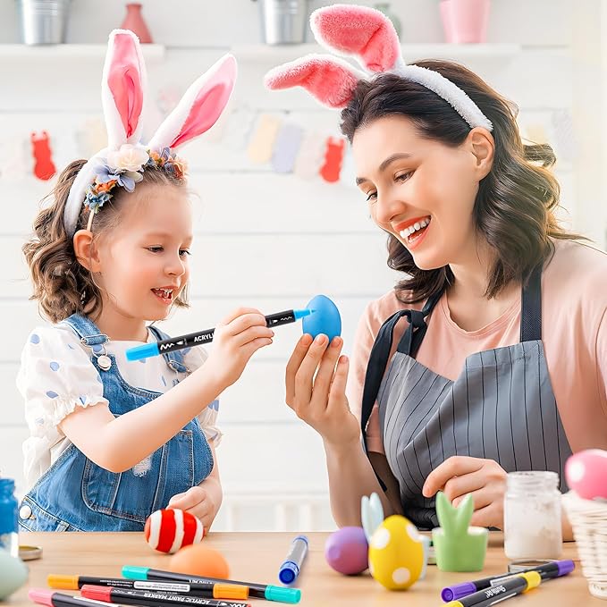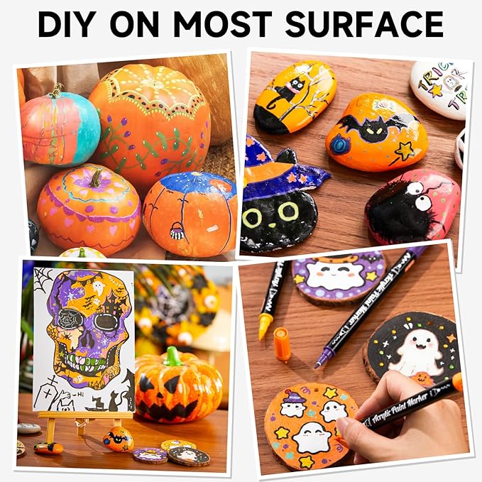 - 【MULTI-PURPOSE】: Enjoy creating art projects on a variety of surfaces, acrylic paint marker set suitable for rock painting, ceramic and mug painting, glass and wine glass painting, wood, fabric, stone, metal, plastic, canvas, Christmas ornament, Halloween pumpkin painting, calligraphy, scrapbook, bullet journal, brush lettering, custom mugs, DIY crafts projects, and much more for both smooth and porous surfaces.