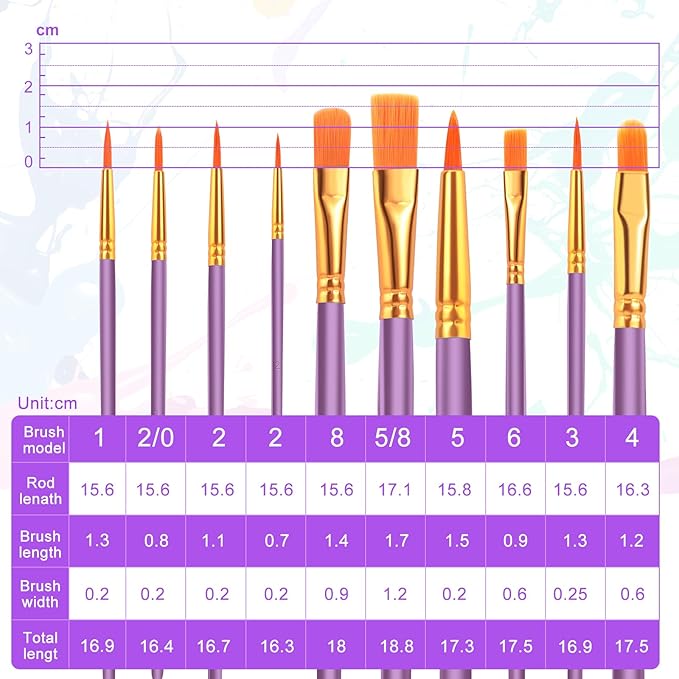 - 【Perfect Combination】:Ten sizes: 5ram 8 8 6 4 5 3 2 2 1 2 + 0, sharp flat angle shape, from coarse strokes to fine details, easy to use color multi-functional acrylic artist brushes, which will meet most of your creative painting needs. Suitable for students, teenagers, children and painters at all levels, a good gift for friends and family who like painting!