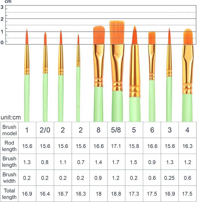 - 【Perfect Combination】:Ten sizes: 5ram 8 8 6 4 5 3 2 2 1 2 + 0, sharp flat angle shape, from coarse strokes to fine details, easy to use color multi-functional acrylic artist brushes, which will meet most of your creative painting needs. Suitable for students, teenagers, children and painters at all levels, a good gift for friends and family who like painting!
