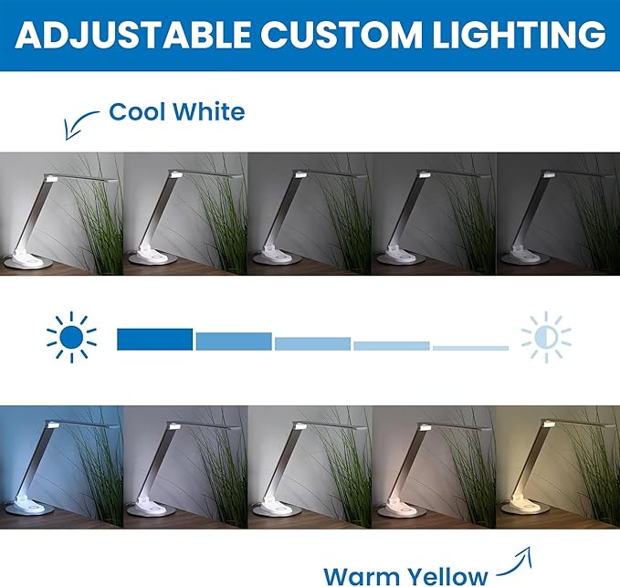 - UP TO 25 LIGHT MODES: Choose from 5 color modes (from warm to daylight or 3000K to 6500K) and 5 brightness settings to experience the perfectly lit desk for your task on hand. Whether it is studying, reading or working on your laptop, our LED desk lamp in silver/white provides the perfect light and adds style to your workspace.