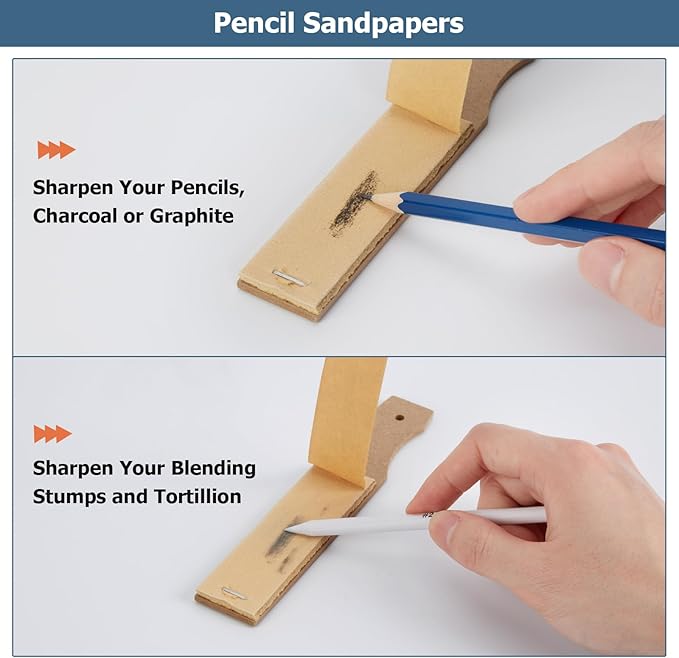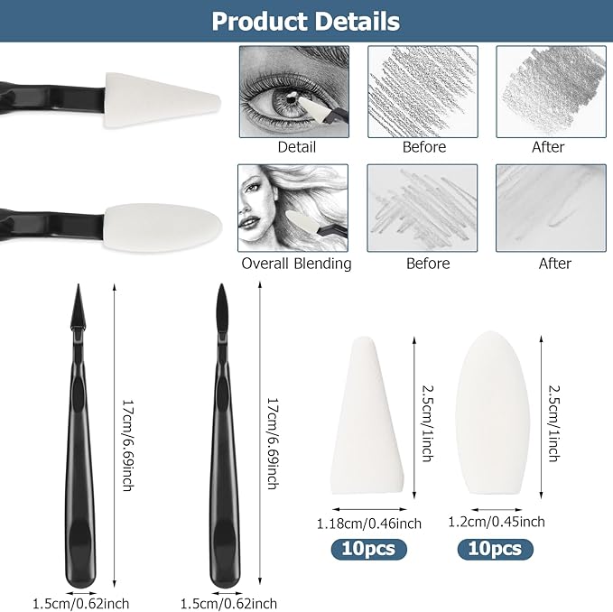 - Package inclusion : The package includes 48 pieces of blending stumps,the sizes are 5, 6, 7 and 8, 1 pieces for each size;blending stumps the sizes are 1, 2, 3, 4, 2 pieces for each size;tortillions the sizes are 1, 2, 3, 4, 2 pieces for each size; 1 pencil extension tool; 2 sandpaper sharpen pads blocks; 2 kneaded erasers,1 sketch rubbing sponge, 2 sketch wipe scrapers, 20 sponge replacement heads (10 oval and 10 pointed) and 1 felt bag.