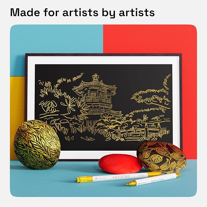 ARTISTRO 2 Gold Dual-Tip Acrylic Paint Pens - Multisurface Markers for Fabric, Plastic, & More, 1 mm Fine & Brush Tips