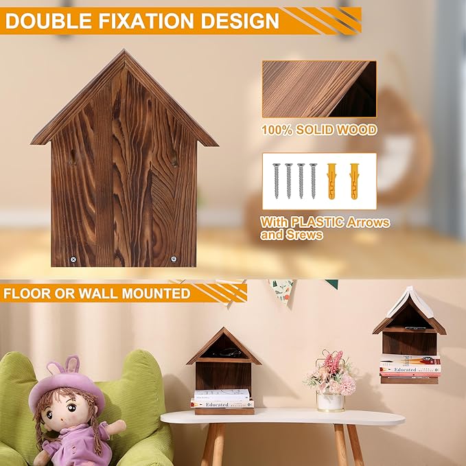 - 【PERFECT SIZE】The wood wall mounted bookcase is 7.48X7.02X11.02INCHES with pen,phone and glasses holders,Triangle Bookshelf is made from 100% pine wood.it is the proper size to hold your book open without taking up too much space