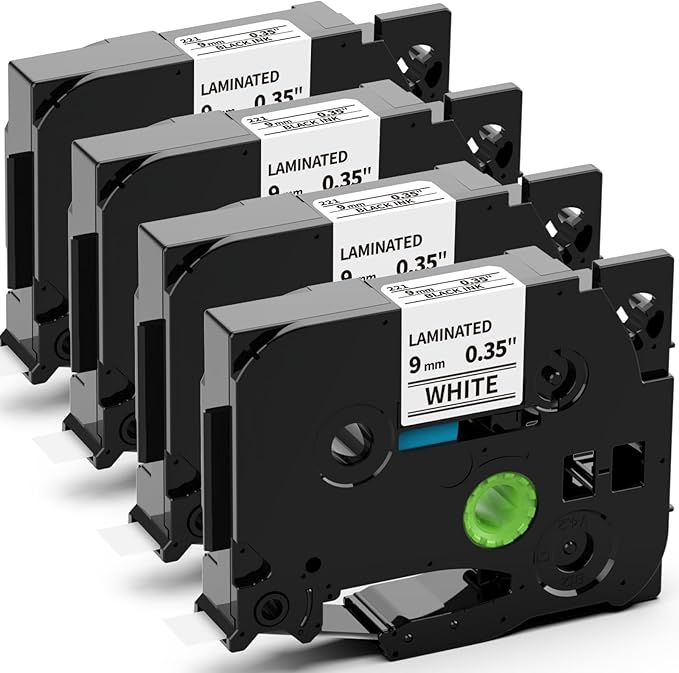- Color: black on white, 4-pack 9mm tze tz tape replacement for Brother TZE-221 TZE221 tz tape 9mm 0.35 laminated white. Size: 9mm x 8m (3/8 inch x 26.2 ft)