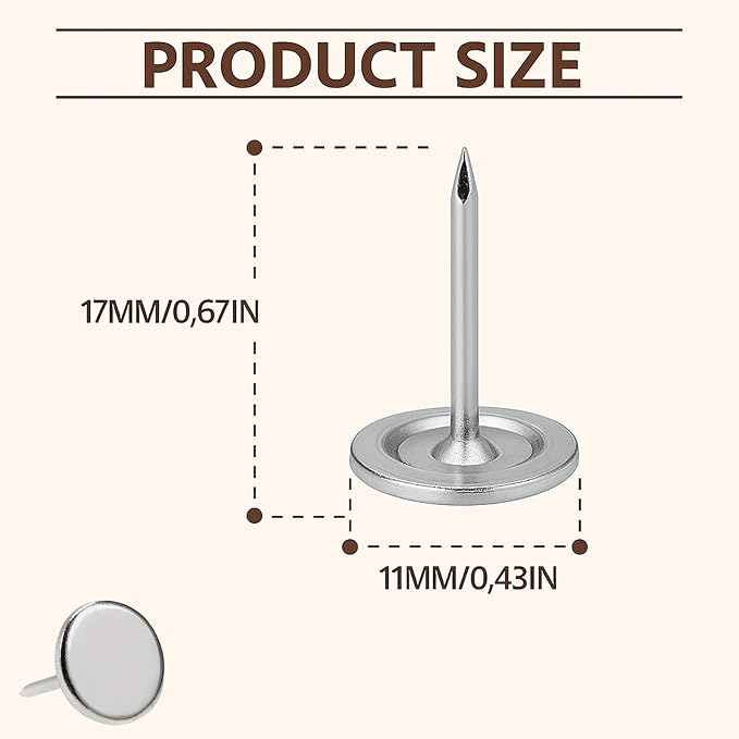 - 1. Versatile Upholstery Nails: Ideal for refurbishing or creating custom furniture, our upholstery nails are designed with a flat head, ensuring a snug fit and a clean look for any project.