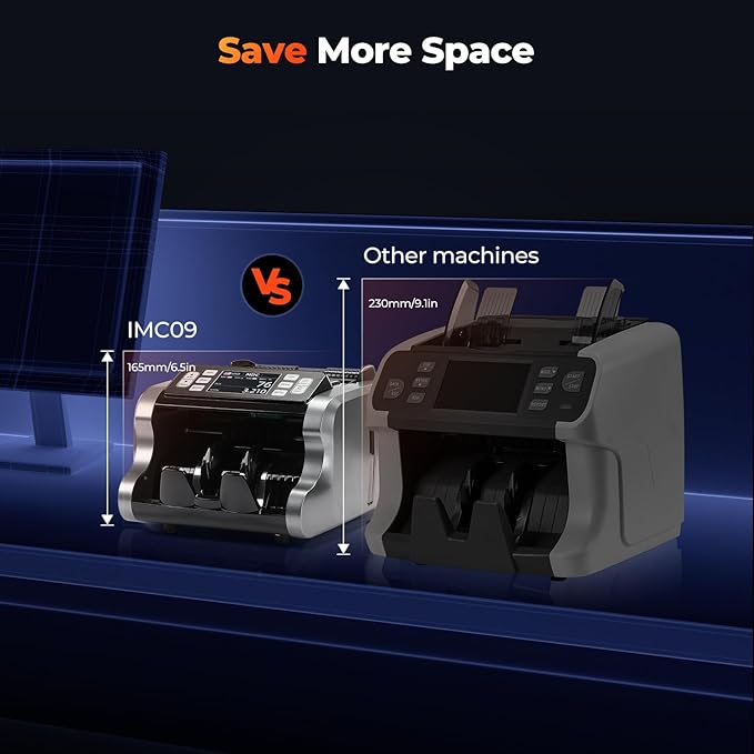- [Fast and Smooth] The IMC09 cash counter machine has a counting speed of 1000 bills per minute. Upgraded roller processing for old bills provides an advantage for counting creased bills. The currency counter can count up to 200 bills in a single run.