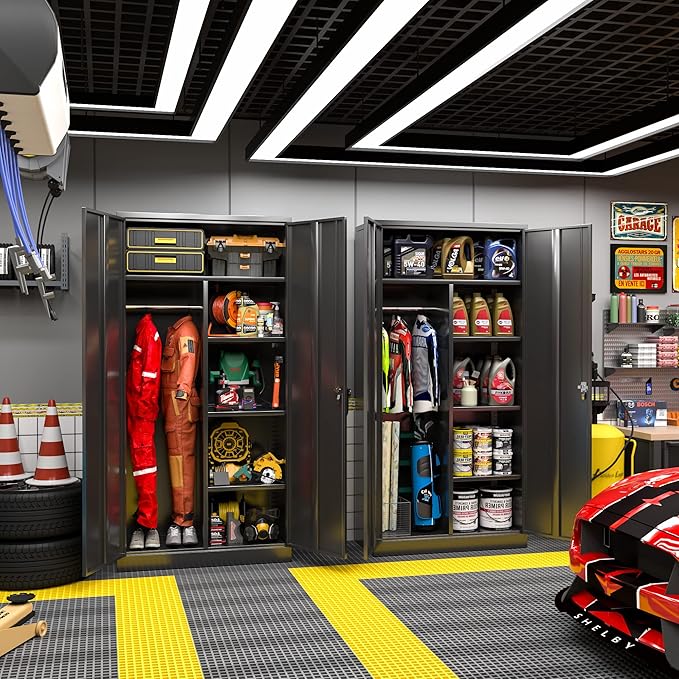 - 【Multipurpose Large Cabinet】Greenvelly 72"H x 32"W x 16"D lockable garage organization cabinet with 2 locking doors and 4 adjustable shelves, can move the shelves up or down according to your need, each layer can bear 180 pounds, suitable for storing office documents and tools, as well as heavy items. Durable black metal bedroom armoires cabinets are an ideal choice for home office, utility room, laundry, kitchen, garage, school, shop, warehouse, business etc.