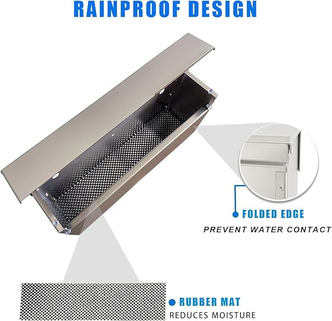 - NO MORE WET MAILS: Our waterproof mailbox has folded edges covering the top of the stainless steel wall mount mailbox, so raindrops will drip down naturally and not get inside the mail box, keeping your items clean and dry. In addition, we include a rubber mat to keep moisture away.