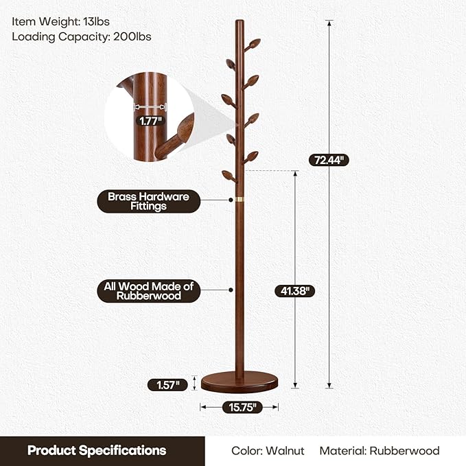 - 【Versatile and Adjustable】: Our walnut wood coat hanger seamlessly enhances any home decor. Its classic tree branch design suits diverse spaces like homes, offices, entryways, living rooms, bedrooms, and hotels. The coat rack stands at 72.4 inches with two 1.8-inch widened main poles. For kids, assemble one pole, customizing height as needed.