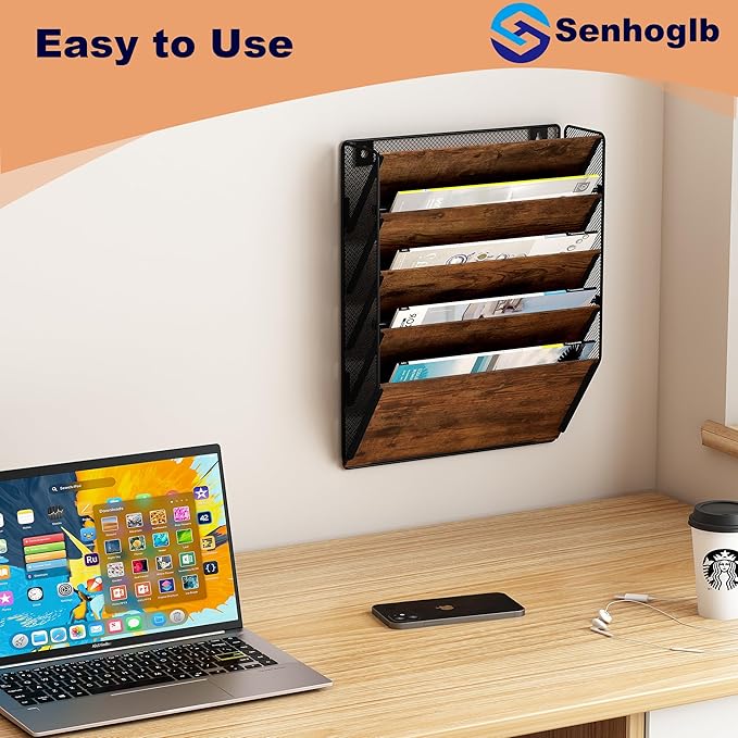 Metal Wall File Holder Organizer, 5-Tier Mesh Hanging Wall File Organizer, Magazine Rack With Pockets, Wood Document Holder for Office Home, Brown