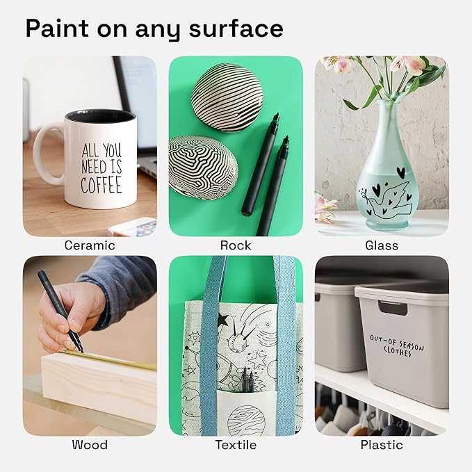 - Multiple Surfaces: Use these oil paint pens as oil markers for plastic and glass or as oil based fabric markers for clothes. Each black pen is water-resistant. They’re also good for leather, vinyl, or epoxy resin. And the nibs are solid, even on rocks!