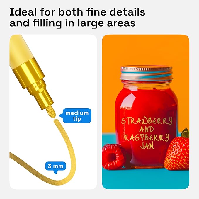 - Multiple Surfaces: Use these gold oil paint pens as oil markers for plastic and glass or as oil based fabric markers for clothes. Each oil based pen is water-resistant. They’re also good for leather, vinyl, or epoxy resin. And the nibs are solid, even on rocks!