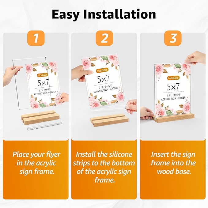 MaxGear L/T Shape Acrylic Sign Holder, 5 X 7 Clear Table Display Stand with Wooden Base, Flyer Menu Holder Photo Frames Paper Stand for Office, Wedding, Restaurants, Hotels 3 Pack