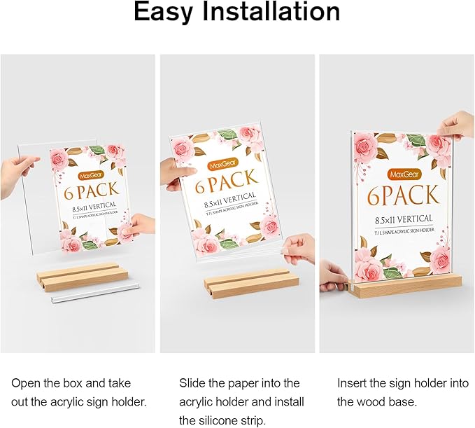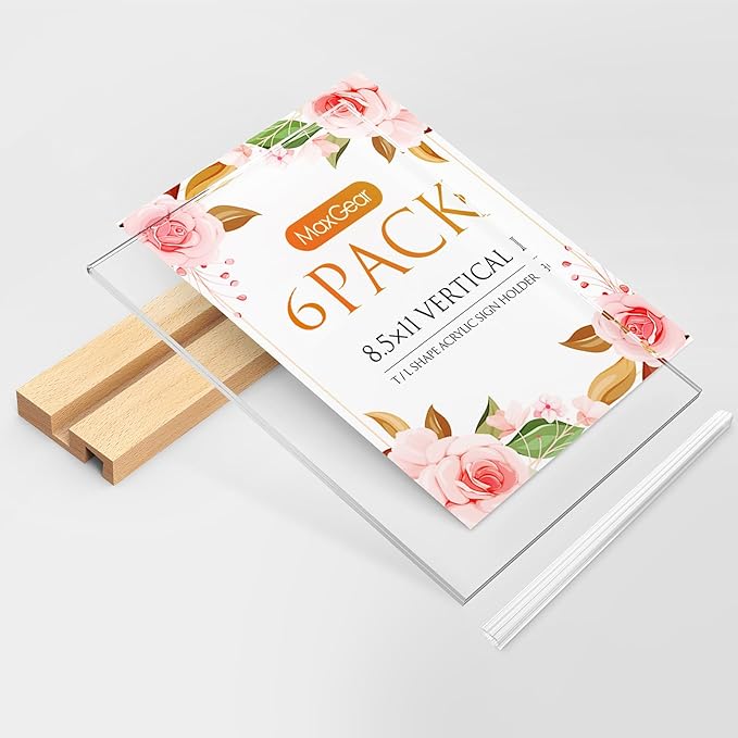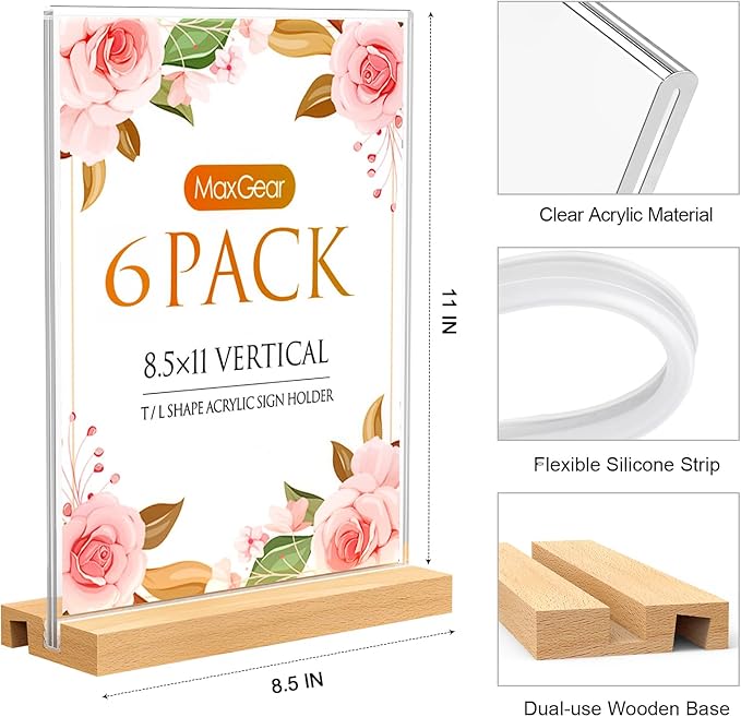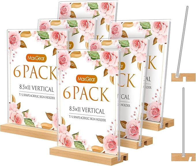 MaxGear L/T Shape Acrylic Sign Holder, 8.5 X 11 Clear Table Display Stand with Wooden Base, Flyer Menu Holder Photo Frames Paper Stand for Office, Wedding, Restaurants, Hotels 6 Pack