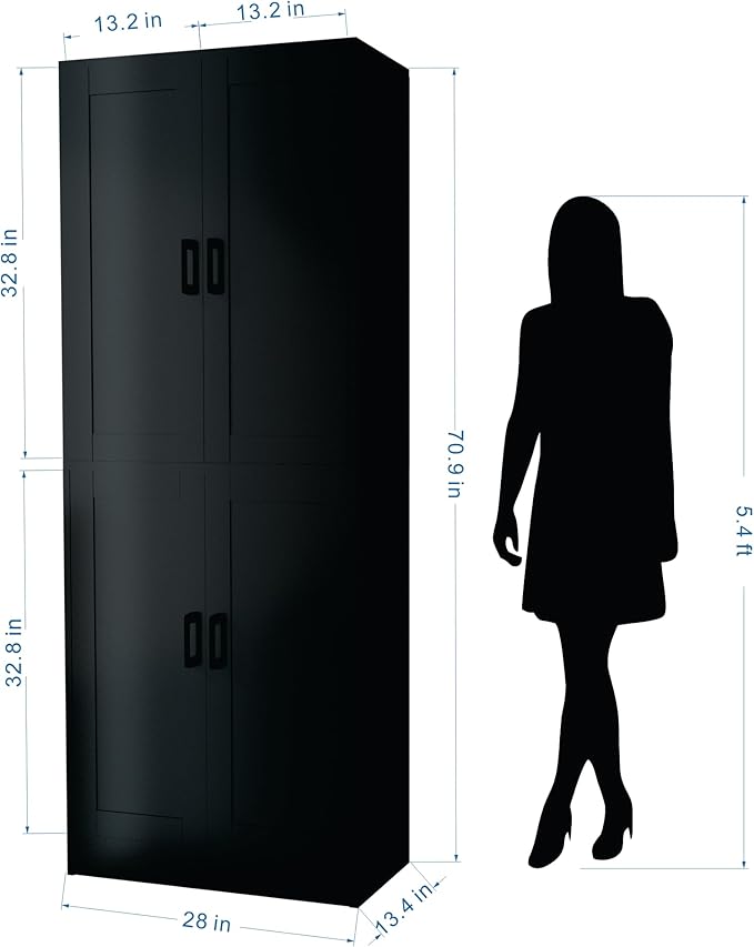 - ✔Multifunctional Storage Cabinet. Our DIYART kitchen pantry works as good as a storage unit and is suitable to use in many different ways at home, such as hallway cabinet or file cabinet in the office. Overall Dimensions: 28"W x 70.9"H x 13.4"D.