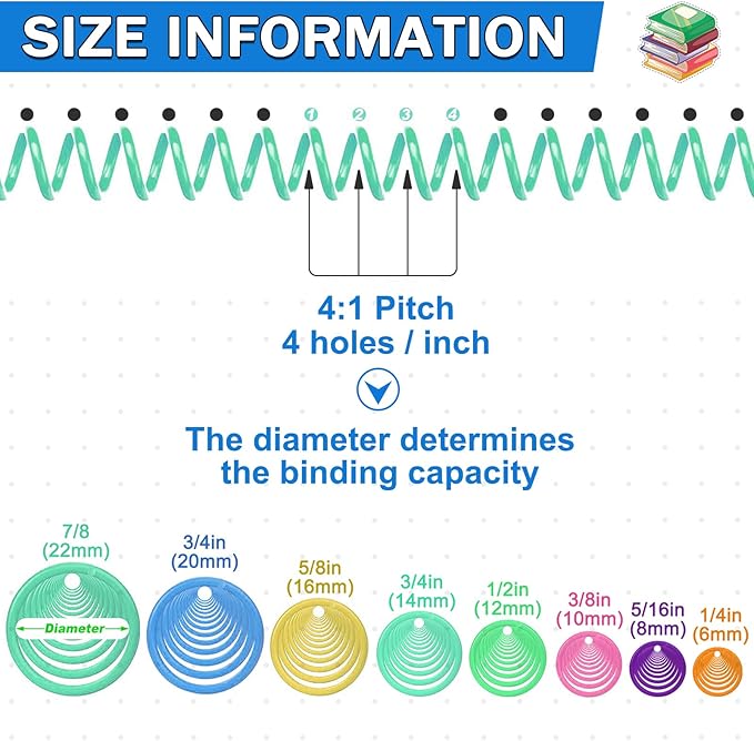 - 【4:1 Pitch & 48 Loops】Spiral Binding Coils (48 loops) are designed with a 4:1 pitch, fit any 4-holes-per-inch coil-binding machine, and letter paper is 8.5 x 11.0 inches. It helps to combine the report pages, calendars, documents, and more, providing much convenience to daily work or study. Their 4:1 pitch matches the 4-holes-per-inch punching pattern on the side of your book.