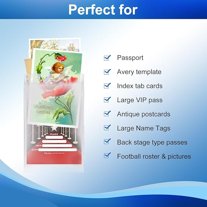 - Holder Size:185 x 115mm/7.28" x 4.53"(L*W), Fit Card Size:155 x 110mm/6.1" x 4.33"(L*W), Perfect for Avery Customizable Name Badge and Ticket Inserts, Printable Name Tag Inserts with Tickets (8522) or 6 x 4 inches Name Badge Inserts. Fit A6 Paper or half A4 Paper
