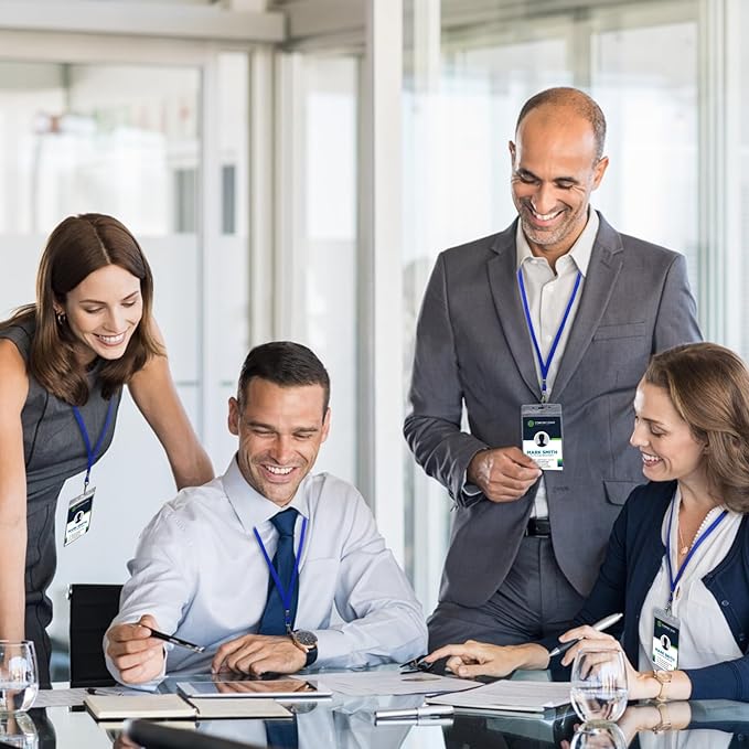 Fushing 50pcs Clear Plastic Vertical Name Tags Badge ID Card Holders and Blue Neck Lanyards with Swivel Hook for School, Festival, Event (XL)