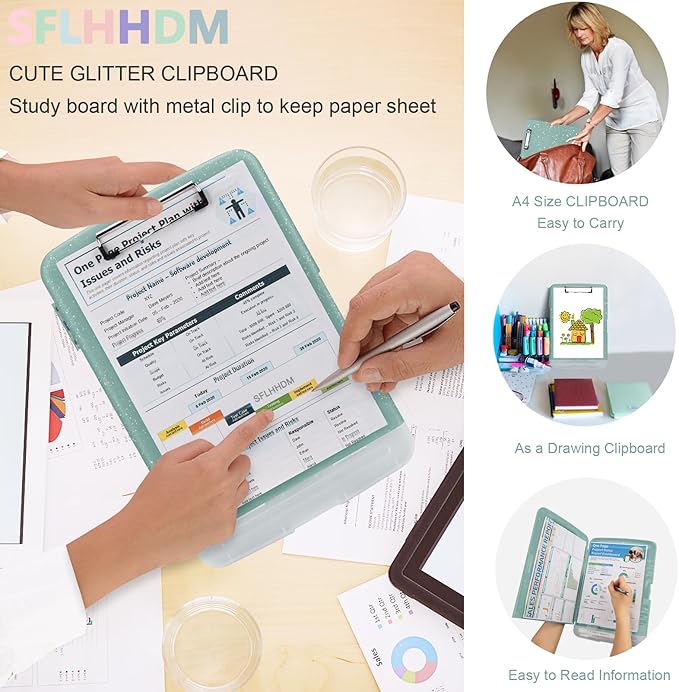 - Glitter Design: Clip boards 8.5x11 with storage have a bright color, Classic and chic glitter elements make this colorful clip boards more attractive. The ergonomic design of the grip is non-slip and comfortable. With this unique clipboard, your daily works are far more fun and easy