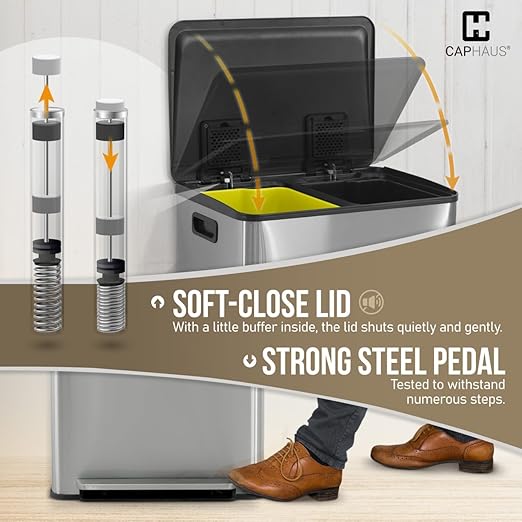 - 🗑️ Durable Construction for Everyday Use - Our dual trash can with lid features two side handles and a sturdy pedal that can withstand numerous steps, ensuring long-lasting functionality. The soft-close lid adds an extra layer of convenience, gently closing to minimize noise and provide a controlled closure every time you dispose of waste. With this thoughtful design, you can enjoy both reliability and ease of use, making it the perfect addition to any home or commercial setting.