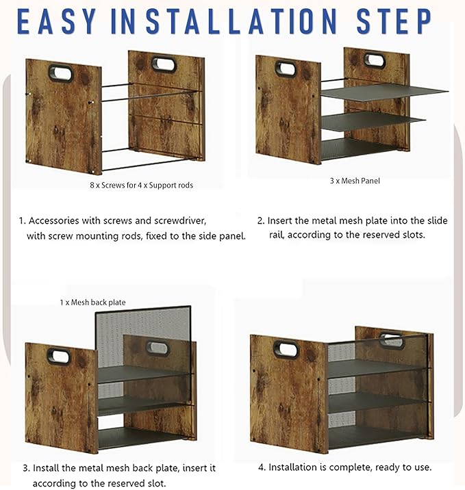 - 【Paper Tray Organzier】 Features 3 tier paper tray for organizing papers, printing papers, copy paper, files, documents, as well as storing office supplies like calculators, pencil cases, alarm clocks, and desk calendars. The 3-tier desktop shelf is a essential storage helper for those who have office desk storage. After receiving and opening the box, the box is equipped with screws inside, only 3 steps to install desk organzier according to the illustration, a few minutes can be installed, the screws reserved screw holes are easy to align, metal mesh partitions reserved slots, easy to insert.