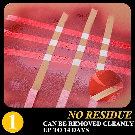 - DAMAGE-FREE: Our color tape use medium adhesive glue that ensured it can be removed easily without leaving a sticky residue behind, won't damage the wall (PS: in indirect or no sunlight environment, can stay on surfaces for up to 14 days with no residue). Specially designed for various surfaces, like flat, smooth or slightly textured walls, glass, metal, wood, baseboards, ceramic tiles, hardwood floors, trim, plastic. Note: For better effect, prevent sticky side long-term exposure to air.