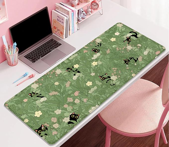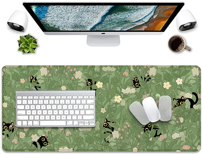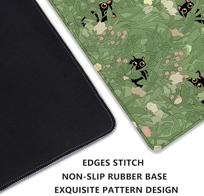 Cute Cats Desk Pad Mouse Pad,Sage Green Plants Flowers Floral Mouse Mat Large,Stitched Edges Non-Slip Waterproof Rubber Base Mous Mat for Office Home Work Gaming(27.5X11.8 in)