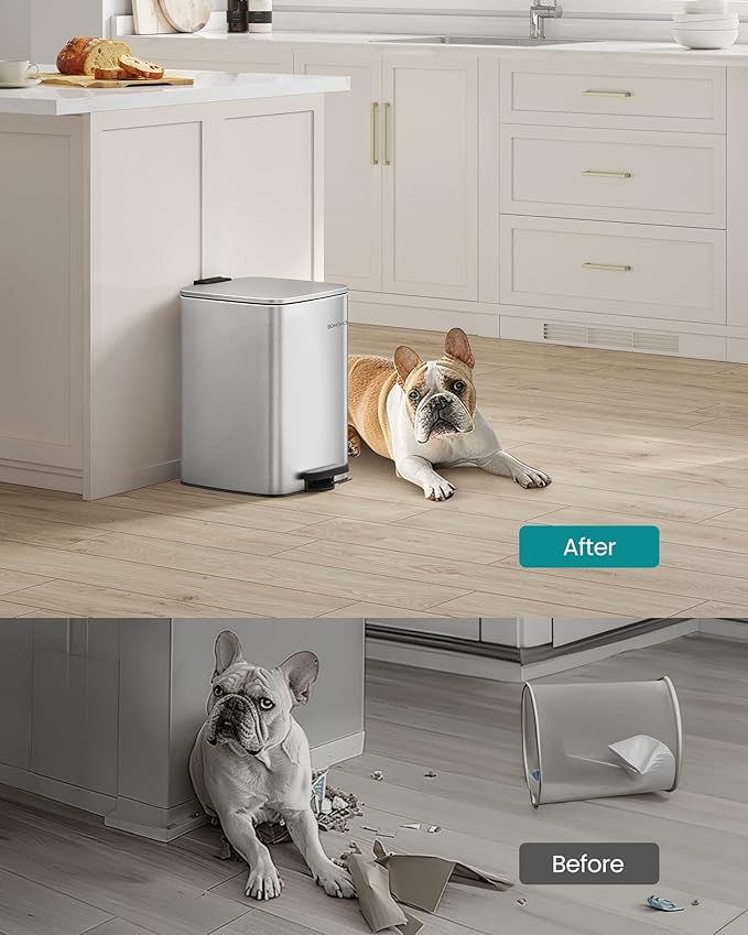 - 【ENHANCED STABILITY】This trash bin is equipped with non-slip pads at the base to enhance its stability, deterring pets from knocking it over and helping to keep your space tidy