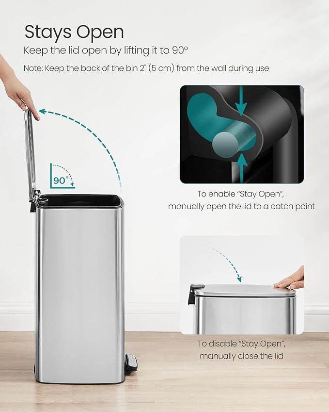 - 【SOFT-CLOSE & STAY-OPEN】This garbage can features a lid that closes quietly and gently without slamming shut. Additionally, you can keep the lid open by manually open it to 90° for easy waste disposal when needed