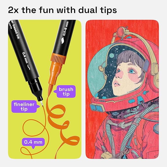 - BRUSH & FINE POINT PENS: Explore endless opportunities with these dual-ended drawing pens. You get 2-in-1 art pens that are both 0.4 mm fine tip pens and dual brush marker pens. These coloring markers are perfect for doodling, coloring, writing, and coloring books.