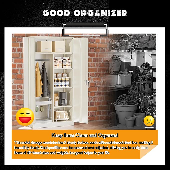 - 【Heavy-Duty Metal Structure】 Greenvelly heavy duty metal closet storage cabinet is made of cold rolled steel with a thickness of 0.8mm and reinforced construction which makes the black metal cabinet with lock sturdy and durable. The garage tool cabinet also adopts a new high-quality powder coating, which is scratch resistant, wear-resistant and easy to clean. The steel locking bedroom armoires cabinet is more safe and reliable, and has no peculiar smell.
