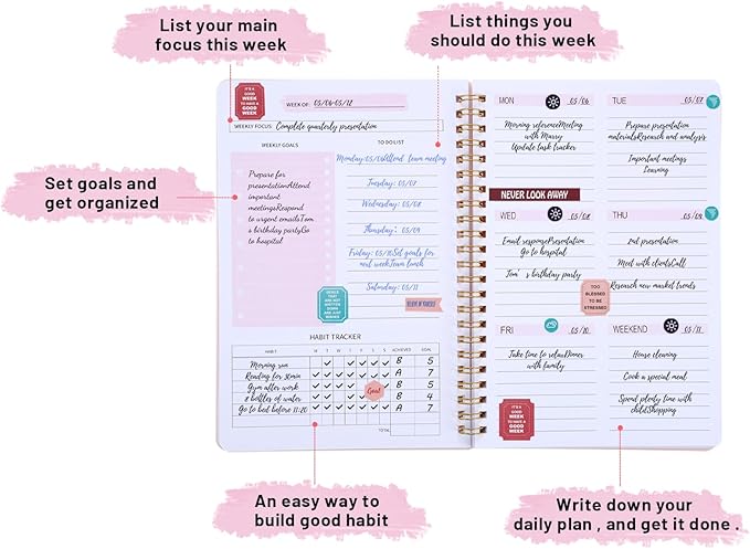 - 【Spiral Binder Planner Notebook】The weekly planner for women is bound in spirals, convenient for turning pages or tearing off used pages to make daily plans again.