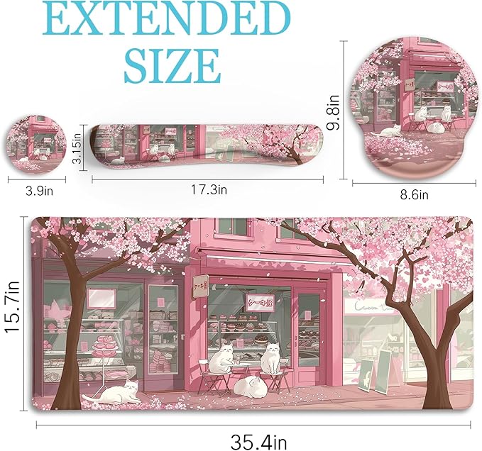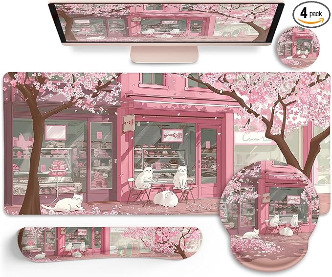 - Cute and Stylish Design: The anime cat mouse pad set features an adorable design of white cats lounging under cherry blossom trees outside a Japanese dessert house. This feminine and cute design adds a touch of charm to your workspace