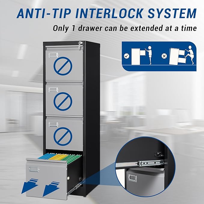 - LOCKABLE 4 DRAWERS FILE CABINET - All the file drawers can be locked by one lock, It is very convenient to control the whole filing cabinet with one key.