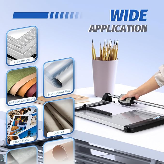 - Wide Application---This rotary paper cutter has a wide range of applications. It can be used for photos, laminating card, cardboard, thin leather, etc, which can especially meet the needs of cutting drawings.