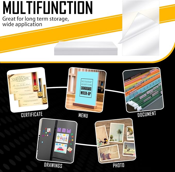 - Widely Applicable: the thermal laminating pouches can be applied to various applications, so you can use them to seal and protect your photos, certificates, brochures, documents, menus, engineering drawings and many other important items, to avoid damping, fading, tearing, and to prolong their preservation time