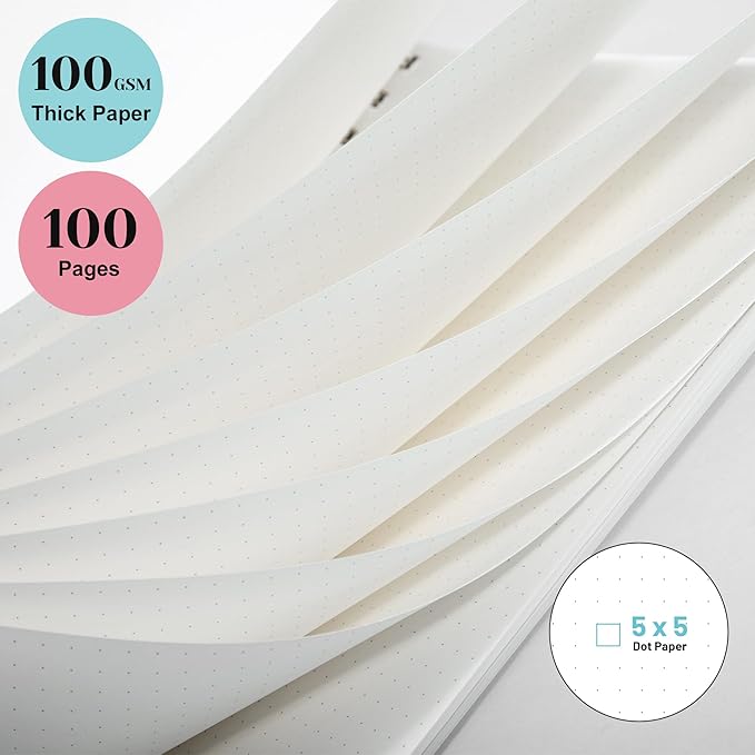 - 100 GSM High-quality Paper -- This dot grid notebook uses 100gsm premium acid-free paper, 5 x 5mm, which is thicker than traditional paper, can write on both sidesοΌ no ink feathering and bleeding. Suitable for most pen types. 50 sheets/100 pages dot paper, It can provide you with a lot of creative space.