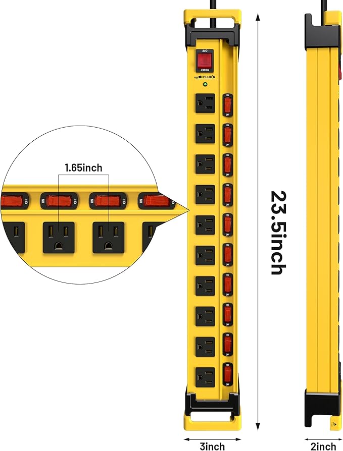- Flat Plug and Power Cord--Long power cord and 1.69 inches wide spacing outlet and 45Β°right flat plug make this 12 outlet strip easy to use and move around;This mountable power strip made of extra-thick aluminum alloy housing with 14 gauge extension cord
