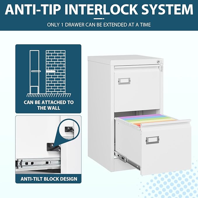 - 【Metal File Cabinet】This two drawer file cabinet is made of cold-rolling steel. A durable steel construction supports dependable lasting use. Each drawer is equipped with hith quality & full extention glide rails.