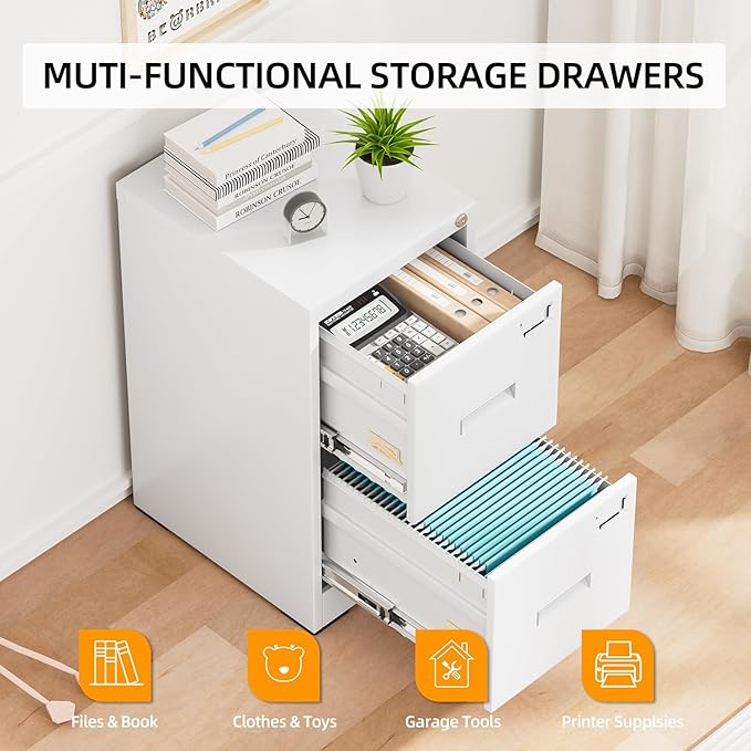- 【Stable Construction】: Metal file cabinets are made of thicker cold-rolled metal material, more durable for long term use. Also, 2 drawer filing cabinet is designed with anti-tilt locking system, which means that 1 lock with 2 keys can lock all drawers, preventing other drawers sliding out and fix cabinets