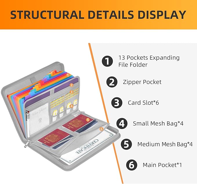 - EXPANSIVE CAPACITY: Discover the ease of JUNDUN's Accordion Document Organizer. Boasting 13 pockets, 1 zip pocket, 1 pen and 6 card slots, along with 4 small and 4 medium mesh bags – all thoughtfully fitted into a streamlined 13.97"x10.43"x1.96" frame. Securely house essential documents and belongings while effortlessly categorizing and swiftly accessing your files