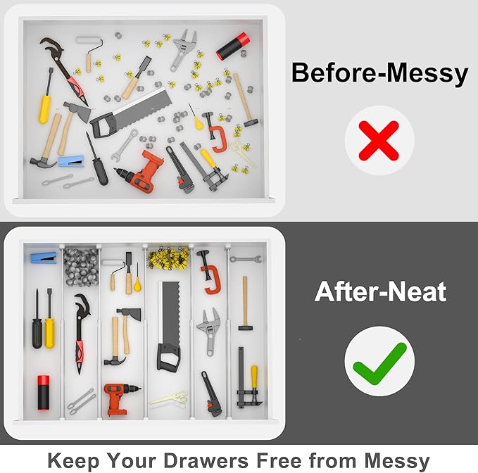 - PERFECT FIT SIZE: Each long divider is 12.6 inches length, 2.36 inches high, the maximum stretching length can reach 22.9 inches, big-hook insert length can expand from 3.5 to 6.3 inches, small-hook insert length can expand from 3.9 to 7.1 inches. All parts of drawer dividers are freely adjustable in length to fit perfectly into every type of drawer