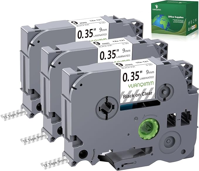 - Package included: 3-Pack Compatible with Brother PTouch TZe-121 TZ-121 TZe121 TZ121 9mm 0.35 Inch Black on Clear Label Maker tape. Width: 3/8" (9mm 0.35 inch), Length: 26.2 feet (8m) for each 9mm 0.35 inch laminated clear label tape