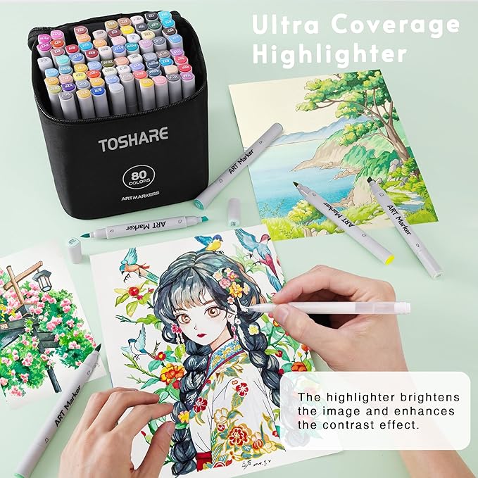 - [ 80 Vibrant Colors + 1 Highlighter Markers ] - Toshare Art Dual Tip Markers come with 80 brilliant colors and 1 multi-functional highlighter pen.Explore the full range of color with 40 dazzling shades to choose from, complemented by a highlighter pen for easy to brighten up the details of the picture,Whether you're filling a coloring book or creating a professional masterpiece, our brush markers will bring your work to life with every stroke.